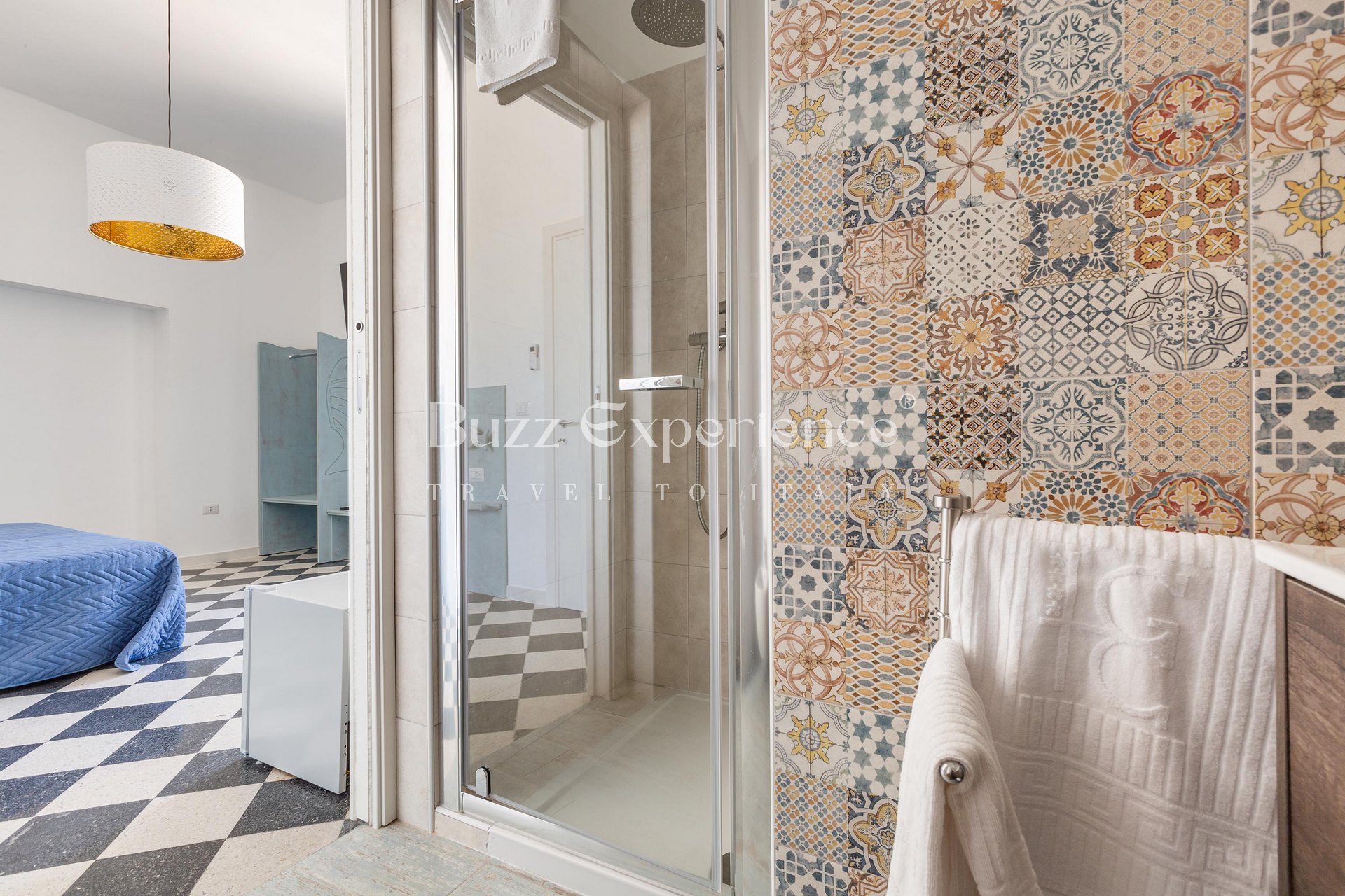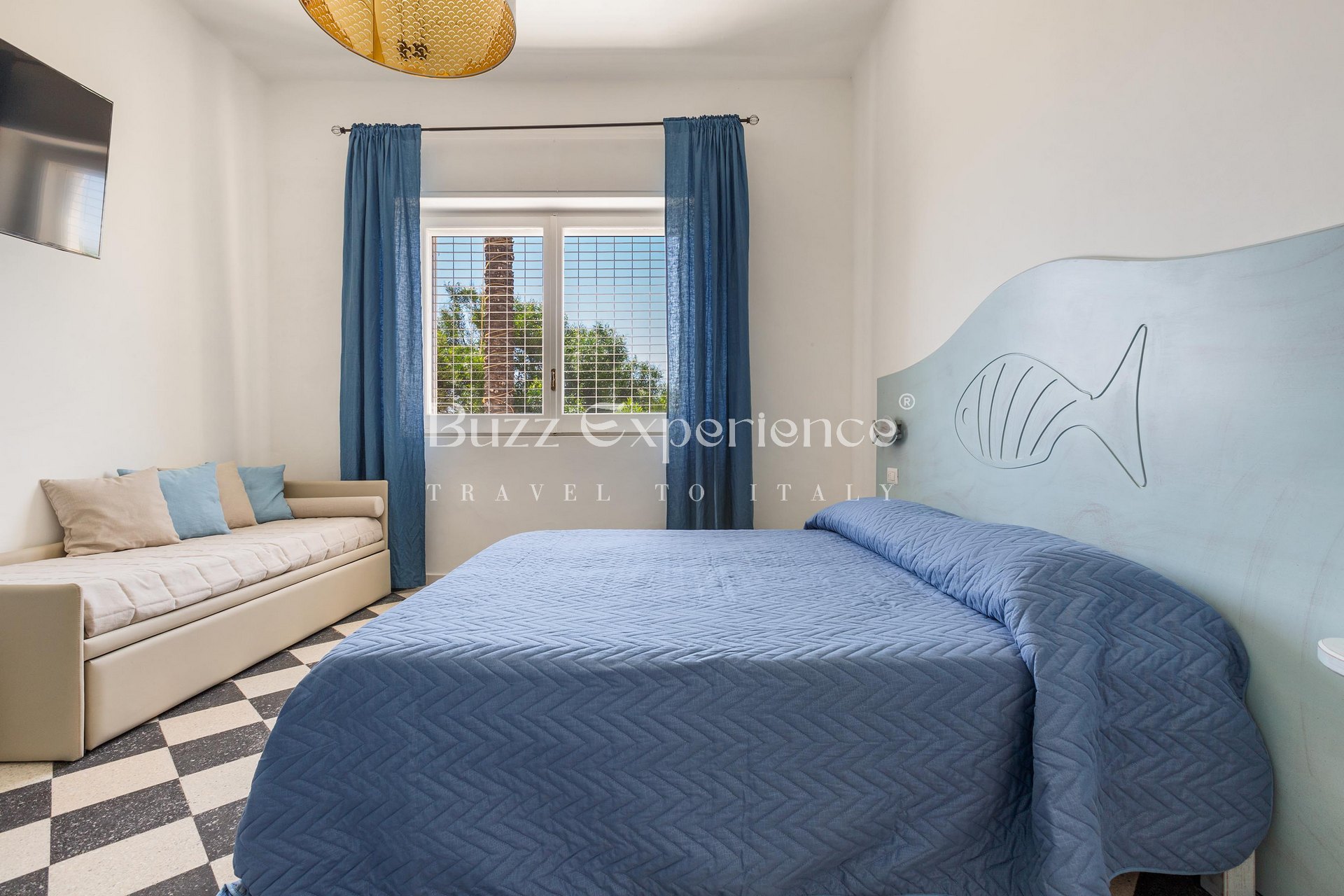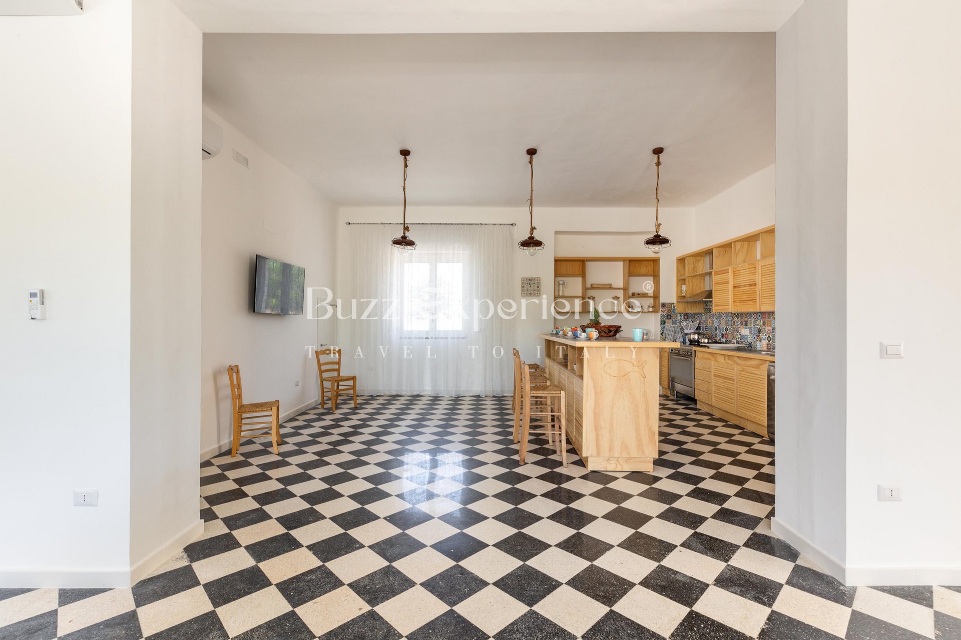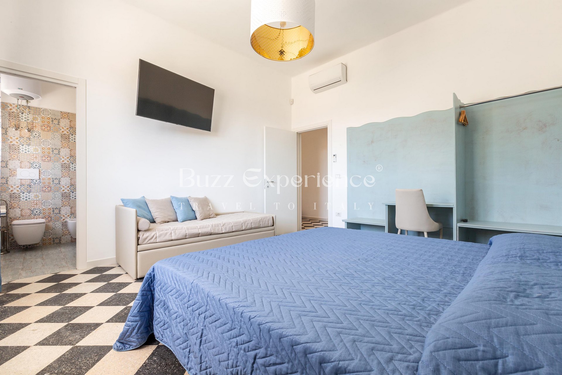 The villa accommodates up to 14 guests across 5 bedrooms, each equipped with Smart TV and en-suite bathroom. Designed with clean lines and bright spaces, the architecture blends the warmth of local stone with contemporary design elements. Every detail — from the checkerboard floors to the handcrafted furnishings — reflects the authentic soul of southern Italy.