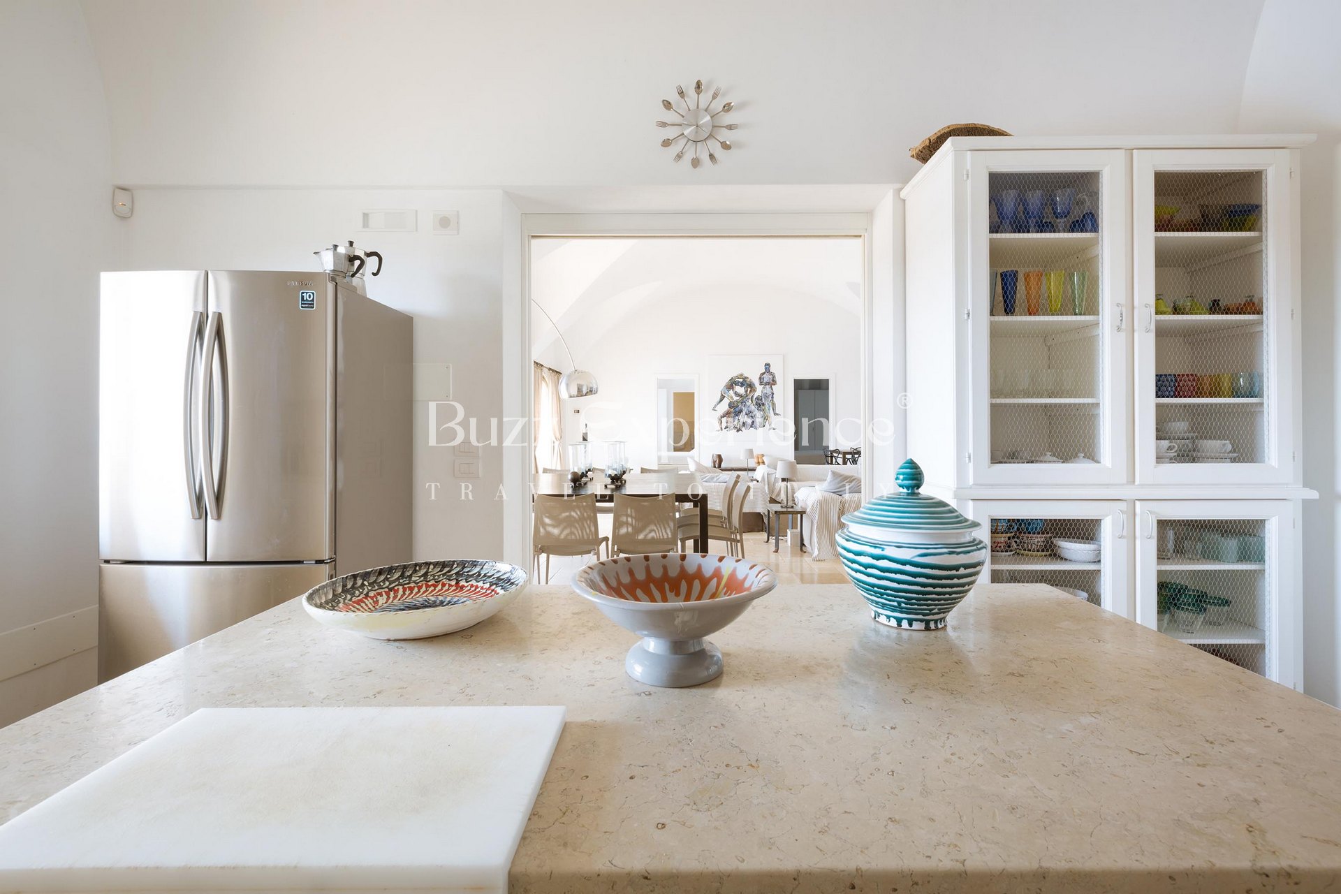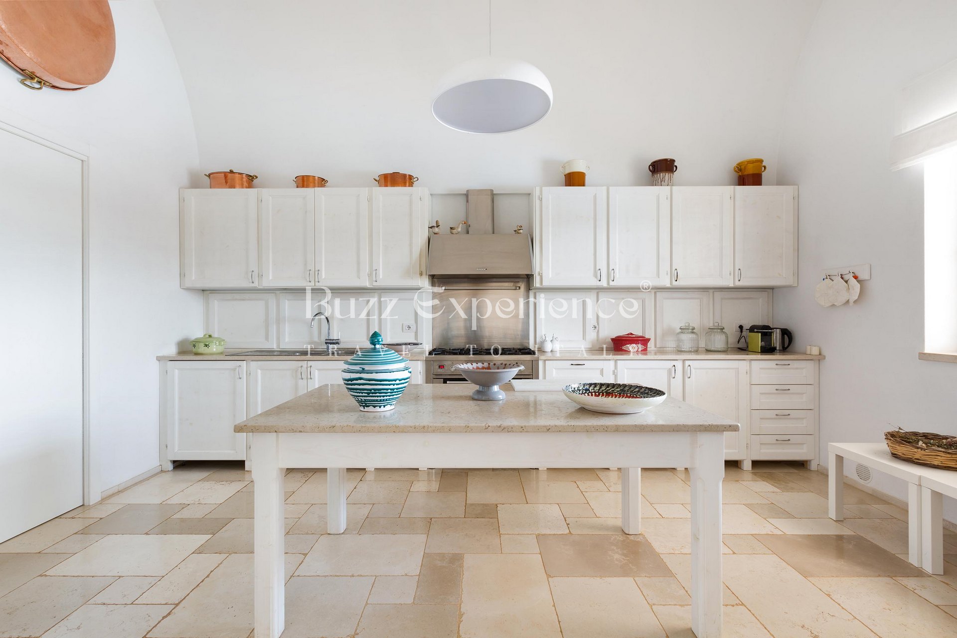 The property combines the purity of whitewashed stone with minimalist interiors, creating a serene and luminous atmosphere. At its center, a spectacular 18×6 m infinity pool glimmers under the southern sun, overlooking olive groves and rolling hills. The outdoor living spaces — including panoramic verandas, shaded lounges, and dining areas — invite guests to enjoy every moment of the day, from tranquil breakfasts to starlit dinners accompanied by the scent of rosemary and sea breeze.