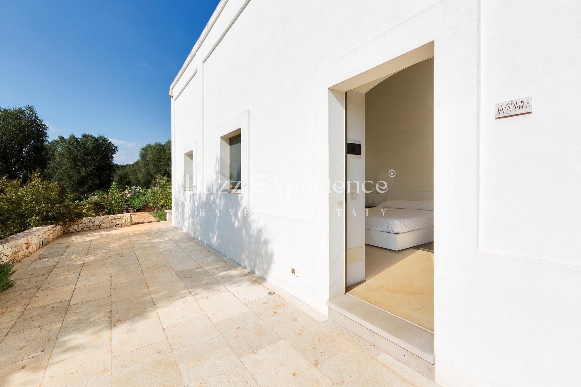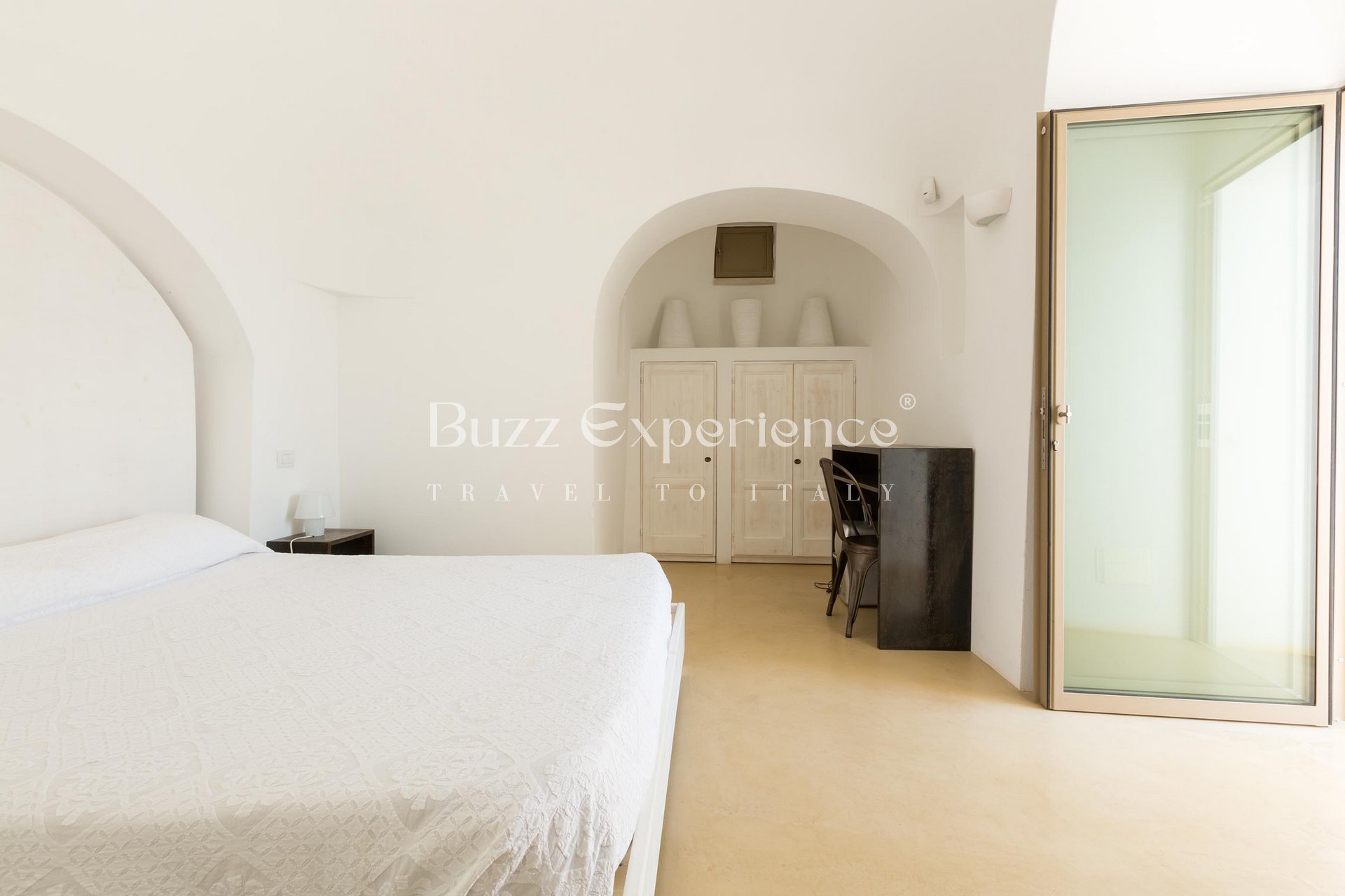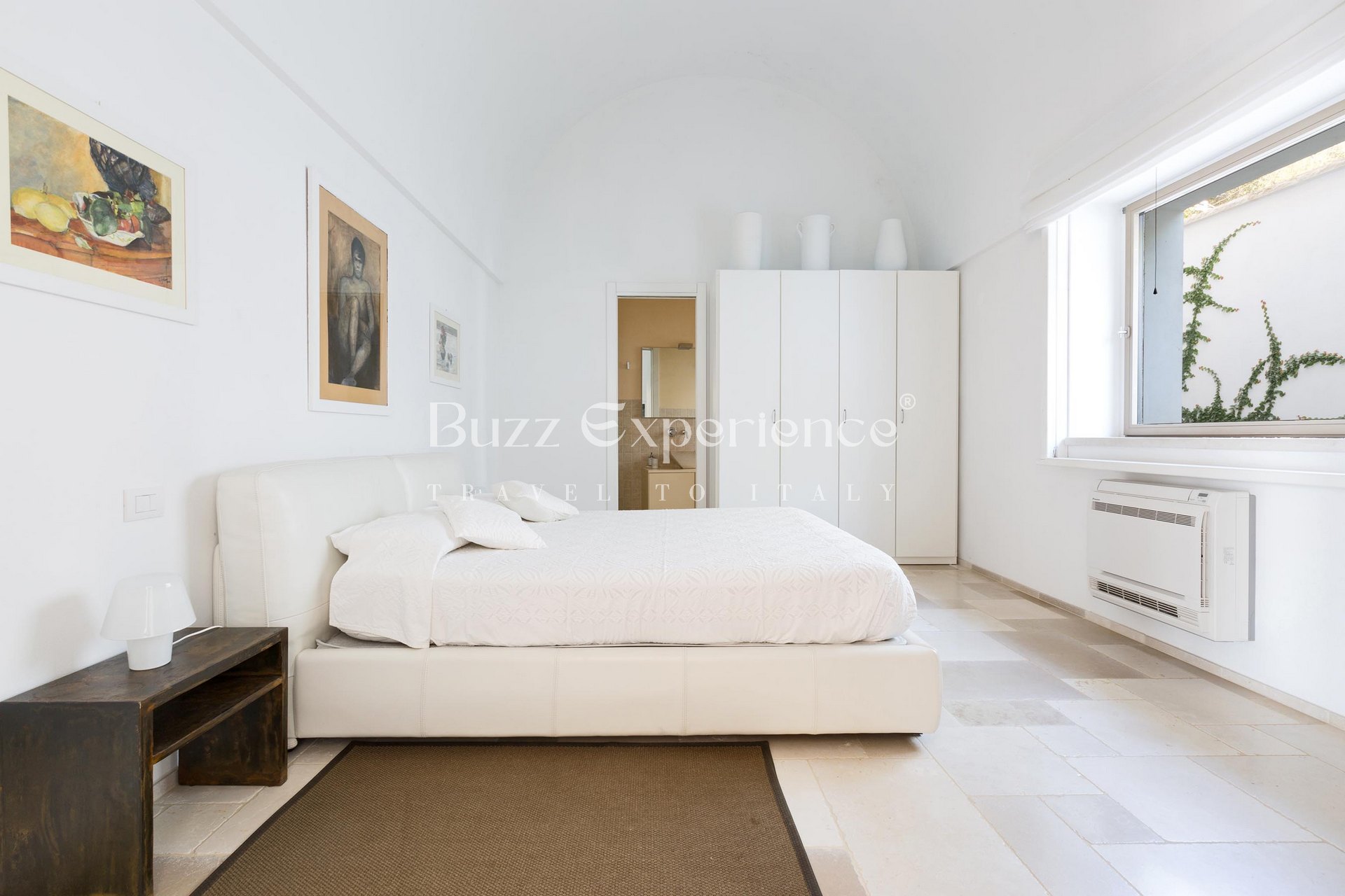 The main house opens into an impressive vaulted living room with a fireplace, designer furnishings, and floor-to-ceiling windows framing the pool. A professional kitchen offers everything required for gourmet experiences, from Apulian feasts to private chef dinners. Two elegant bedrooms with en-suite bathrooms complete this main residence.