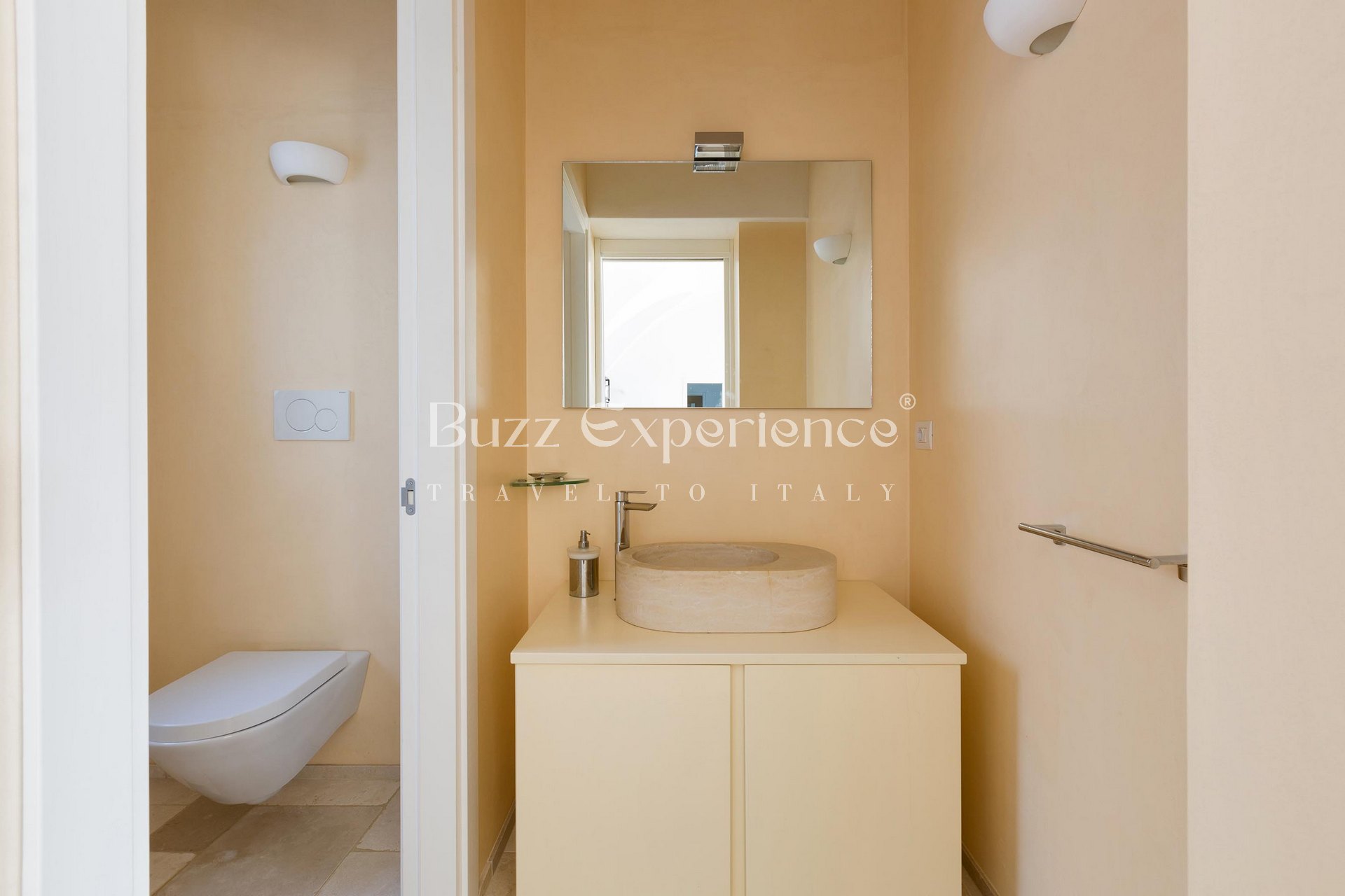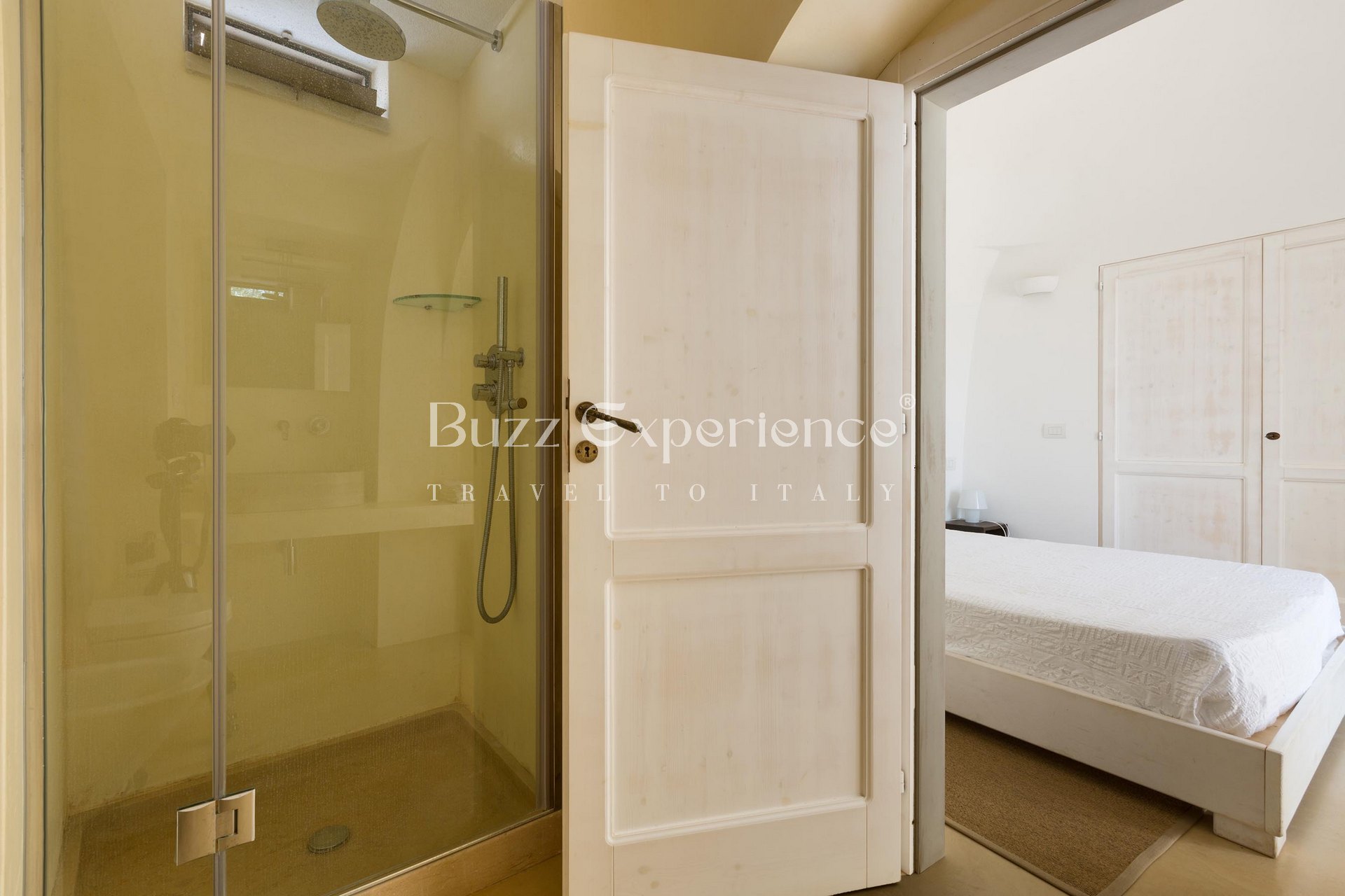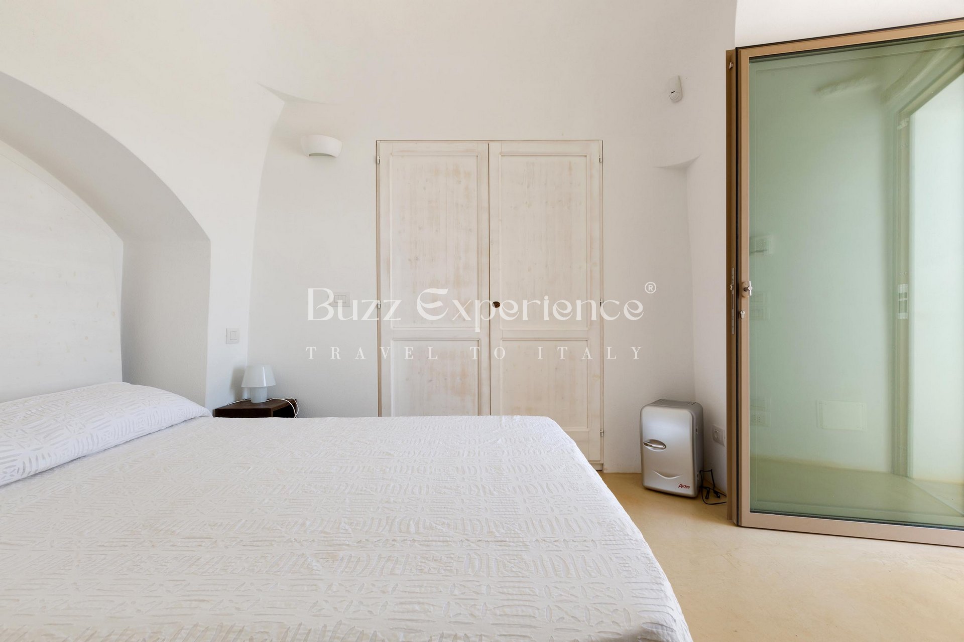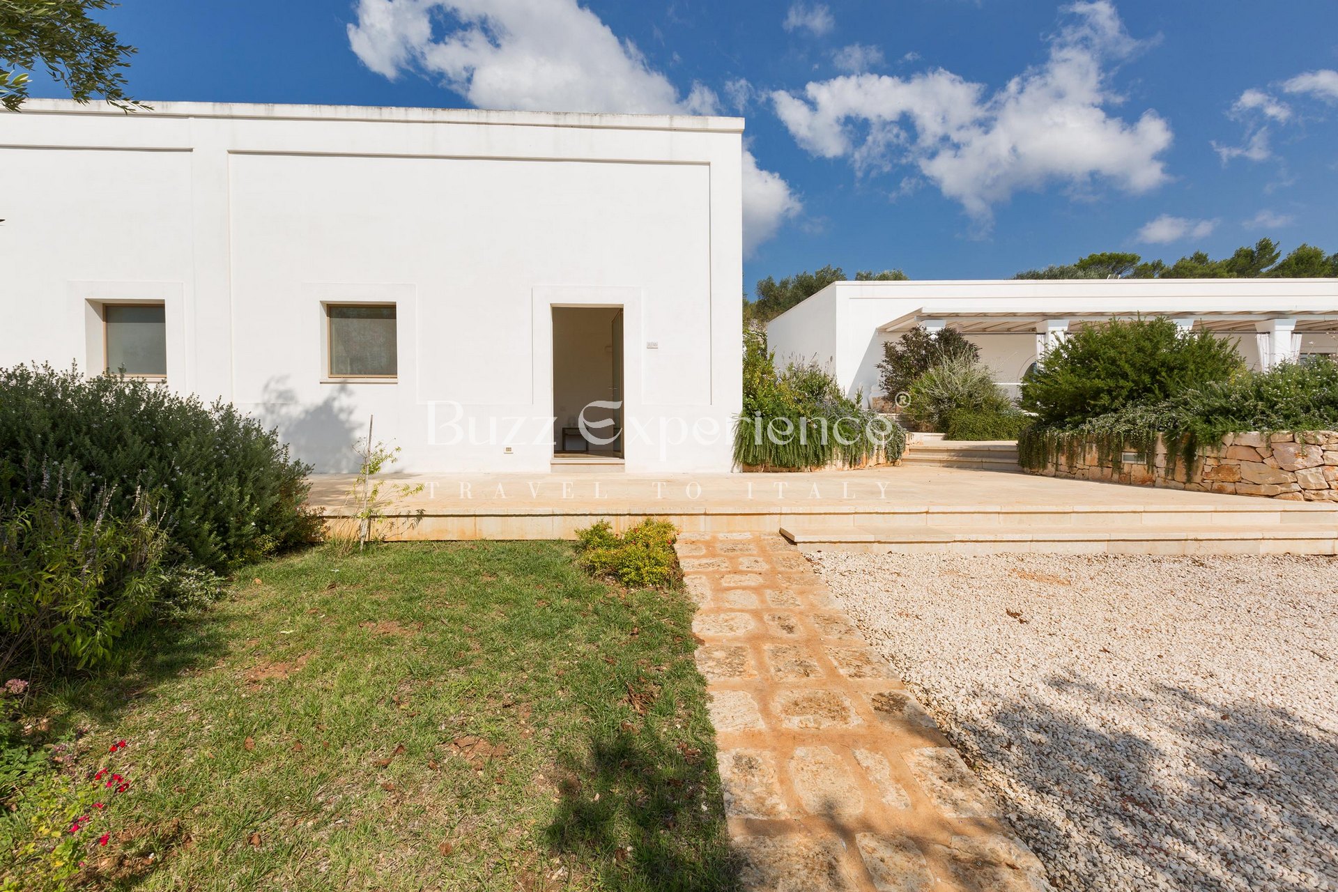 The main house opens into an impressive vaulted living room with a fireplace, designer furnishings, and floor-to-ceiling windows framing the pool. A professional kitchen offers everything required for gourmet experiences, from Apulian feasts to private chef dinners. Two elegant bedrooms with en-suite bathrooms complete this main residence.