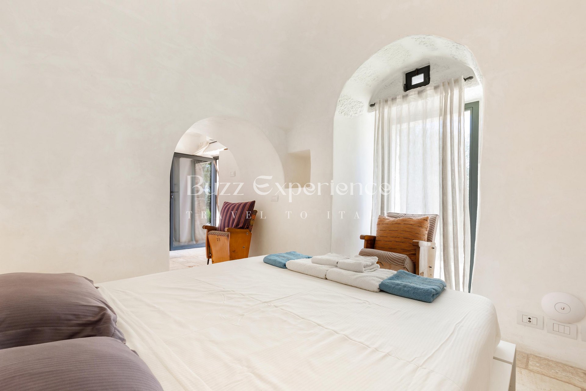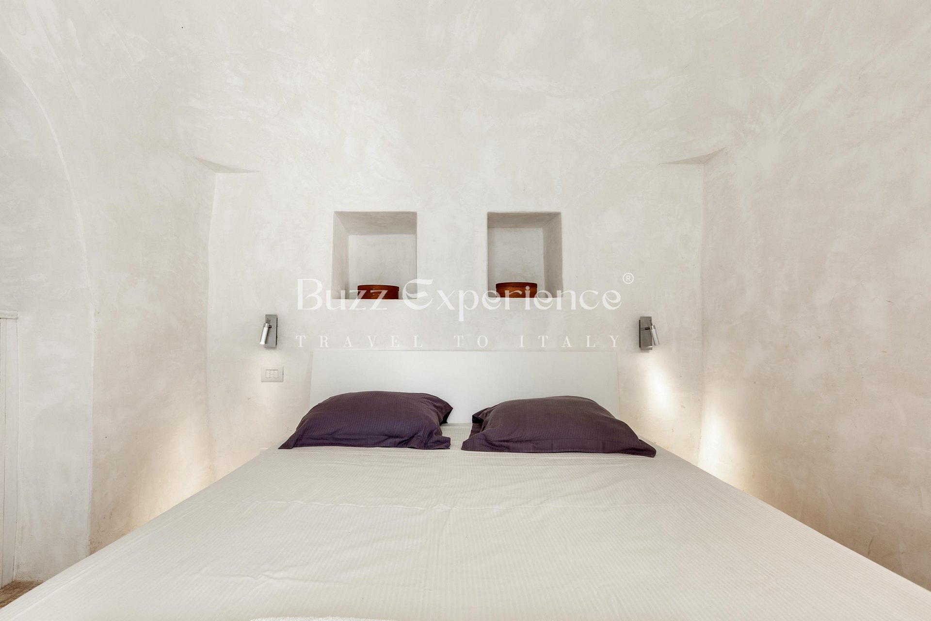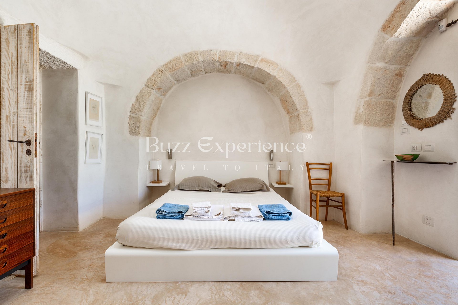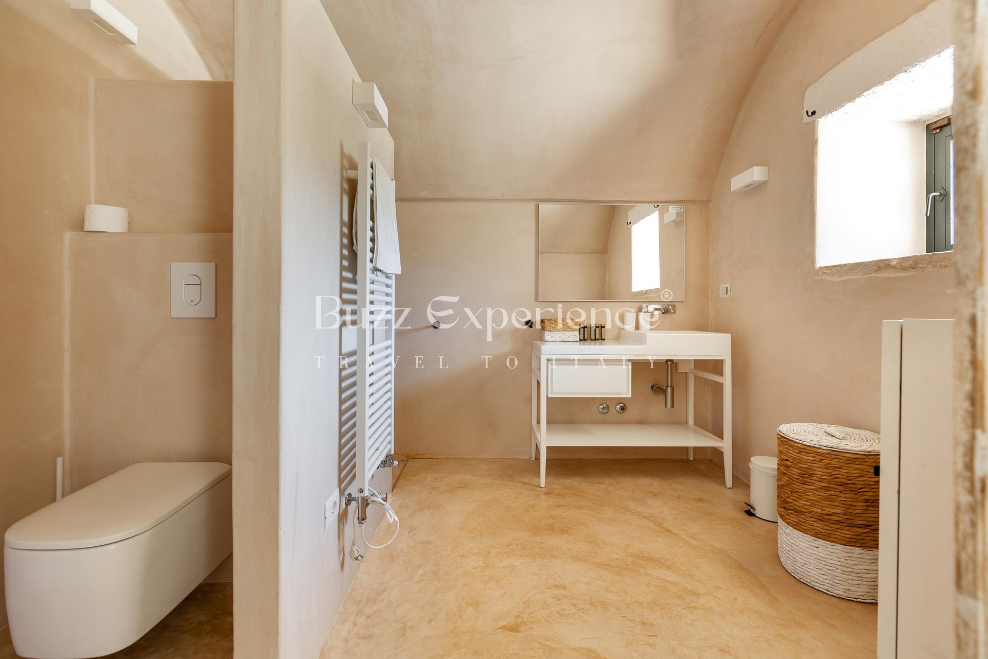 • Trullo Piscina – bedroom and bathroom with poolside view.