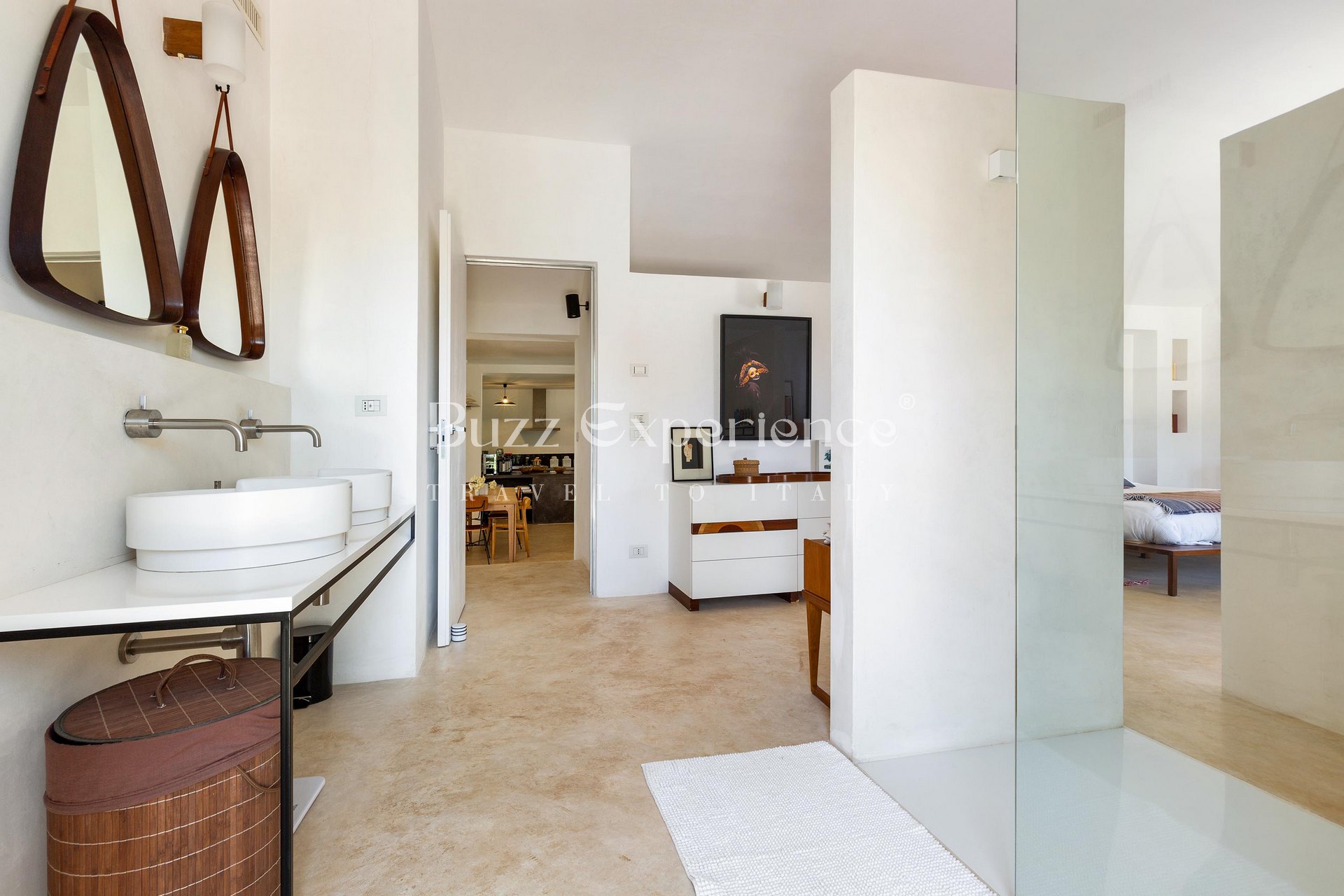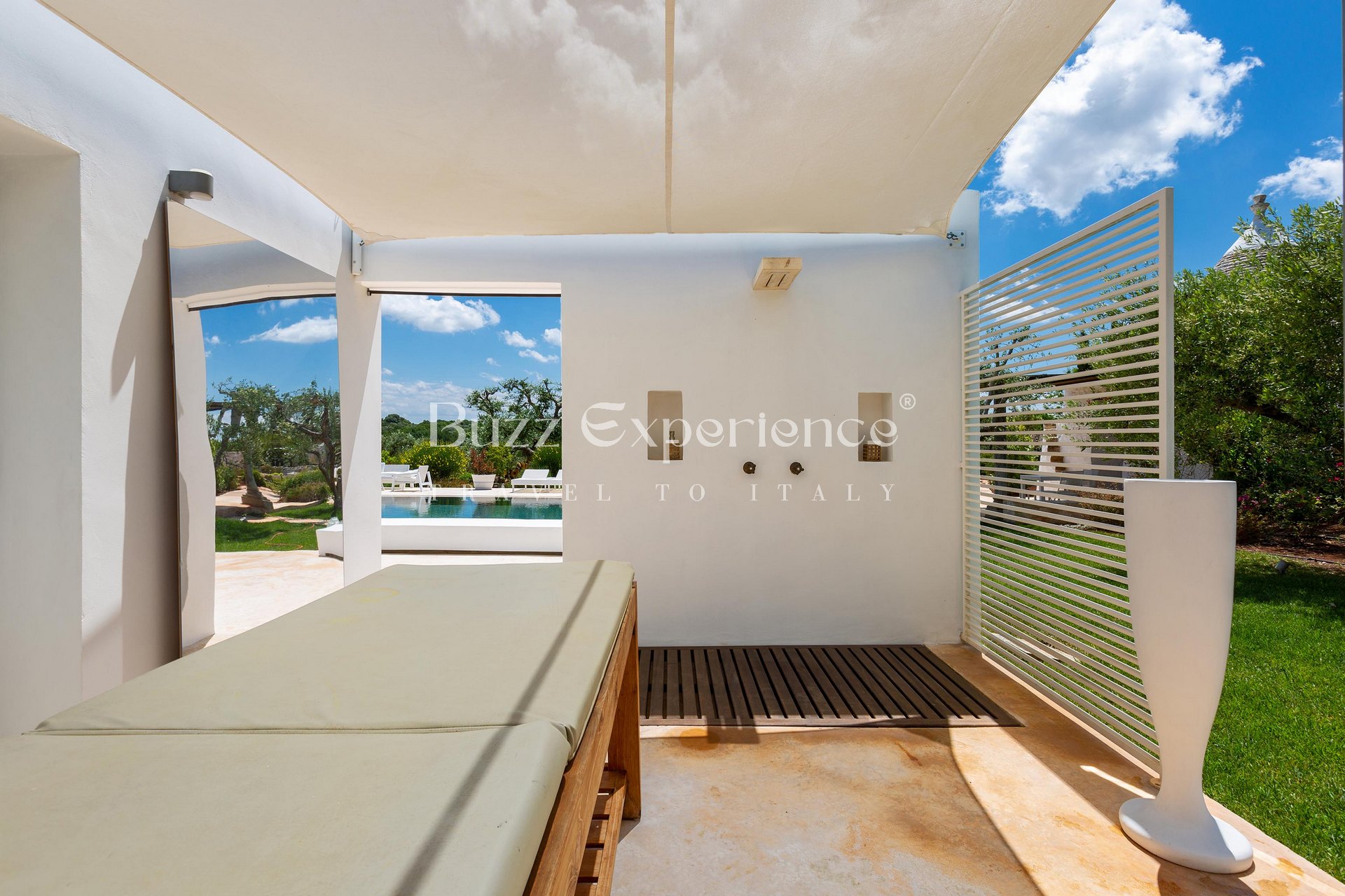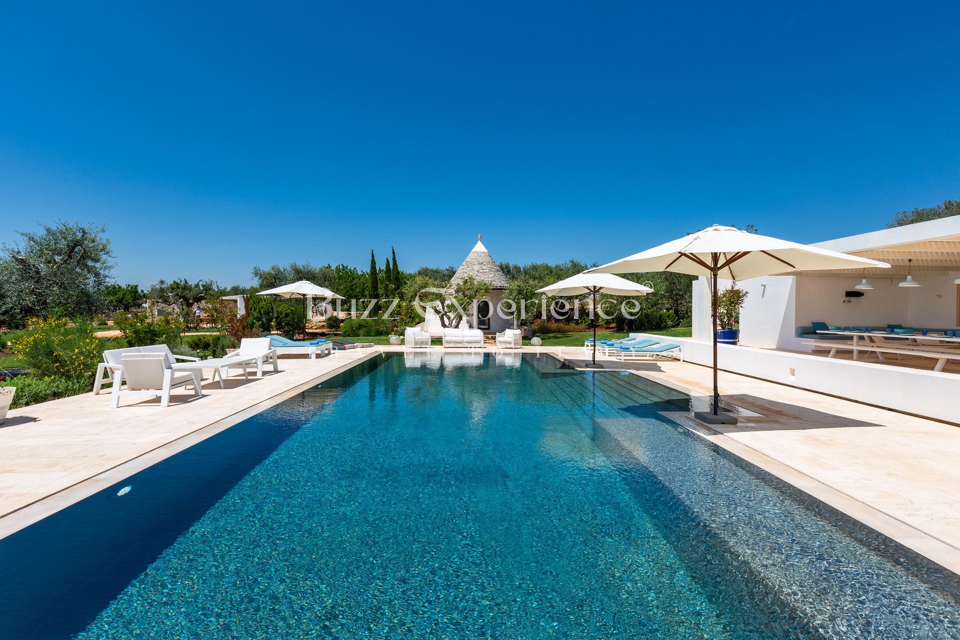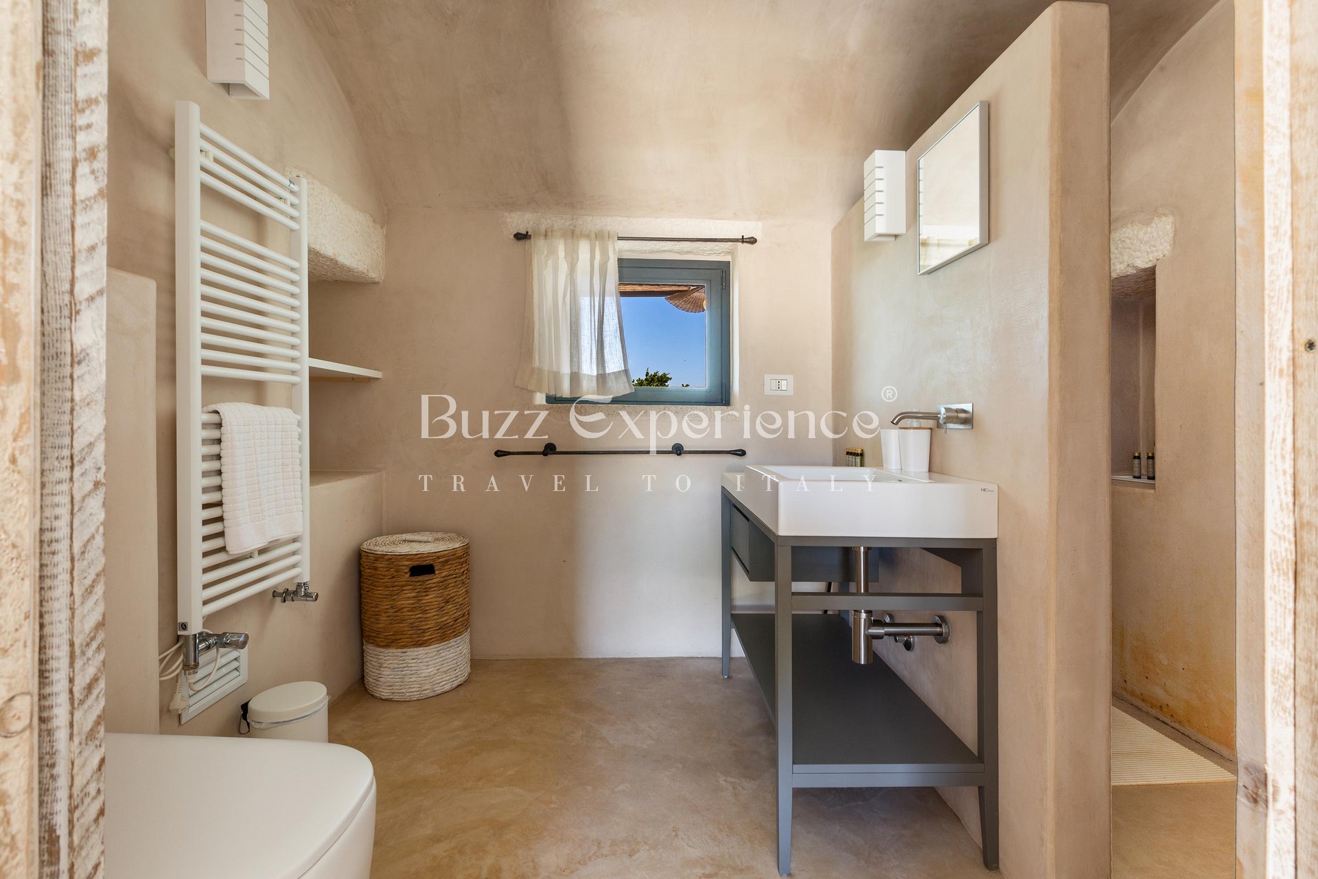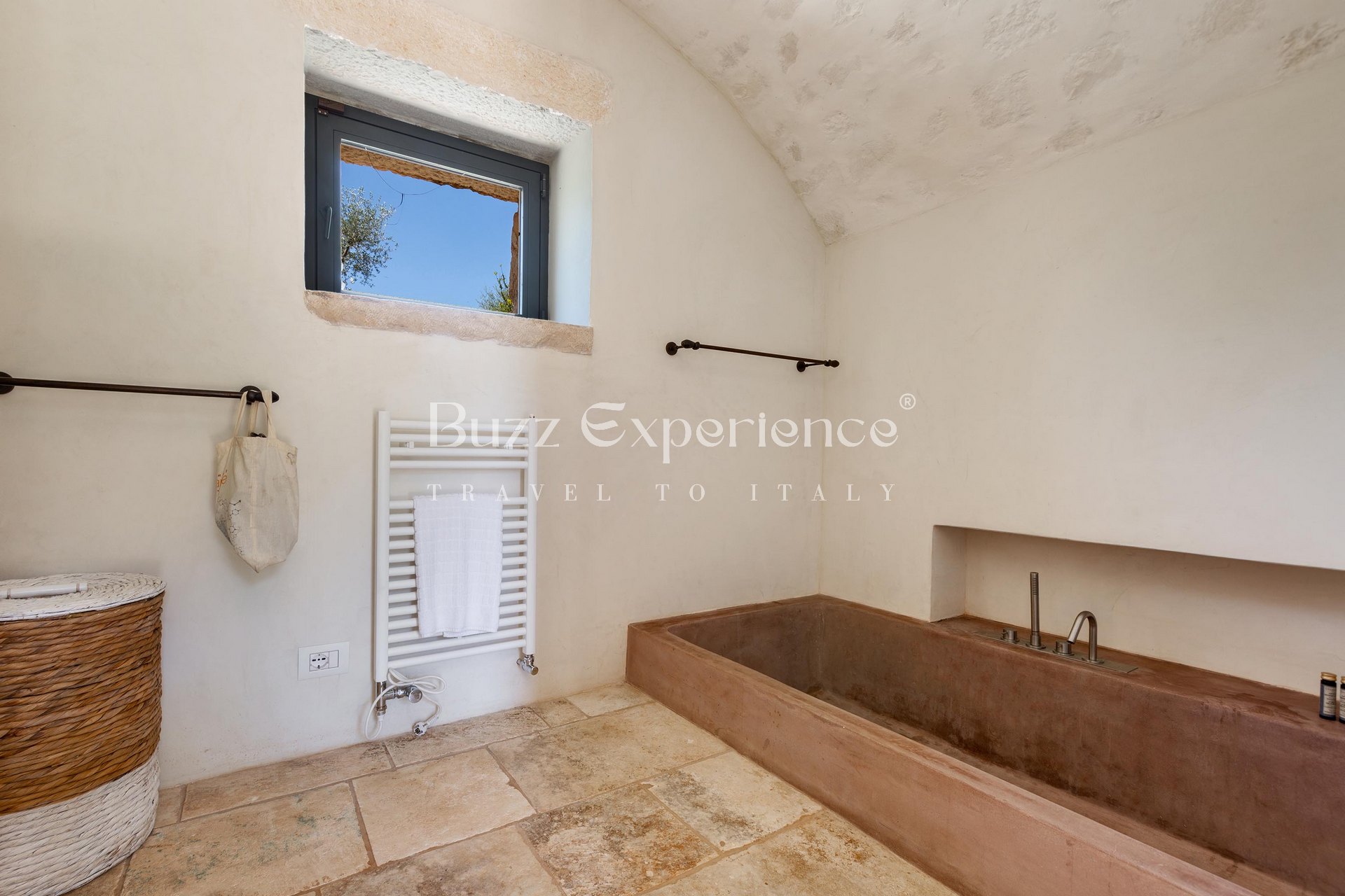 • Trullo Piscina – bedroom and bathroom with poolside view.