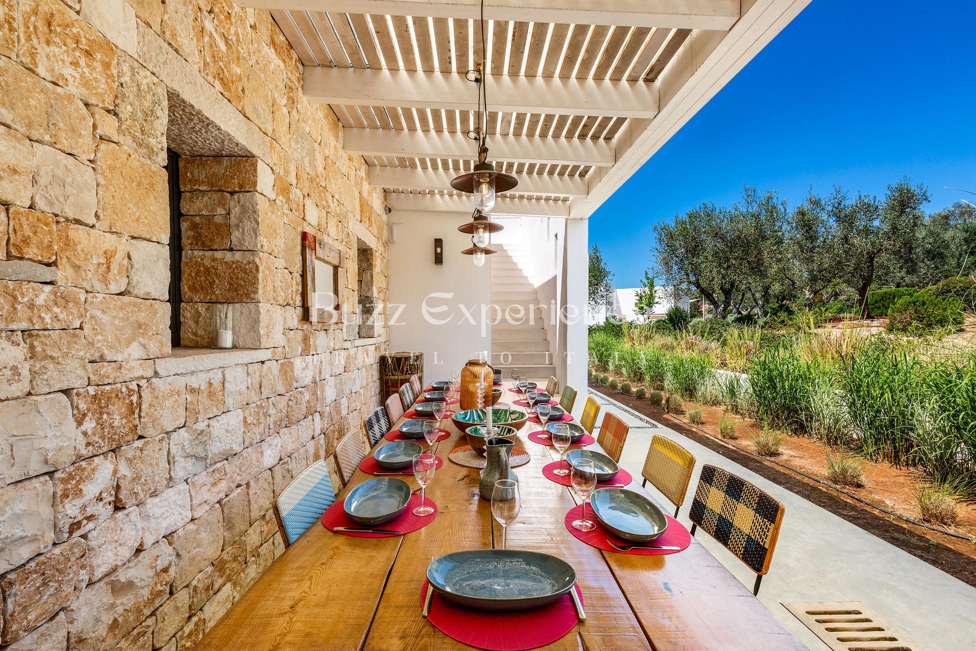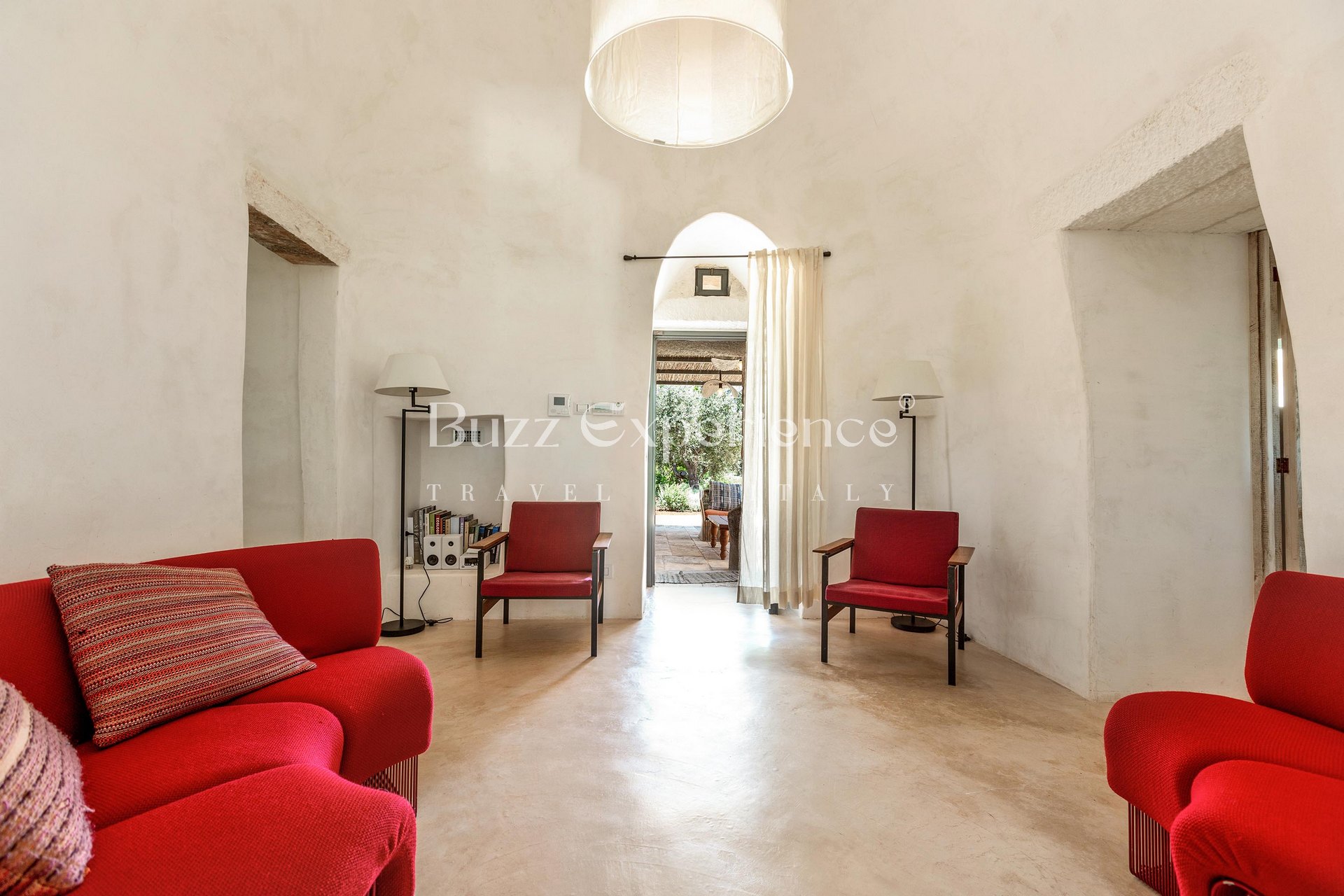 The three main suites offer king-size beds, en suite bathrooms, and a serene ambiance with soft tones and natural materials. Around the villa, twelve authentic trulli have been converted into luxury guesthouses — each with its own private entrance, shaded patio, and unique layout.