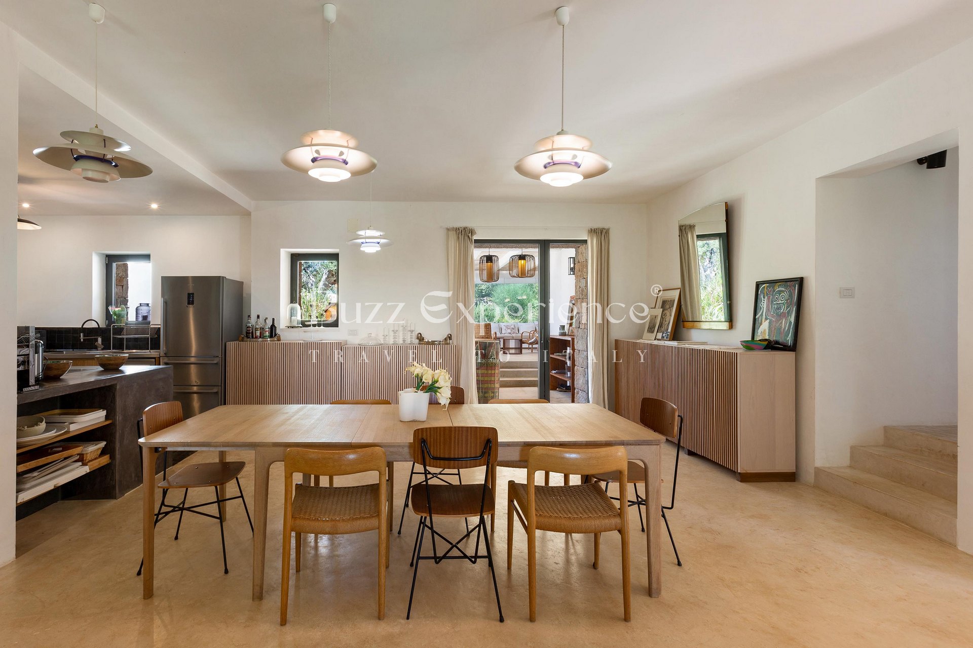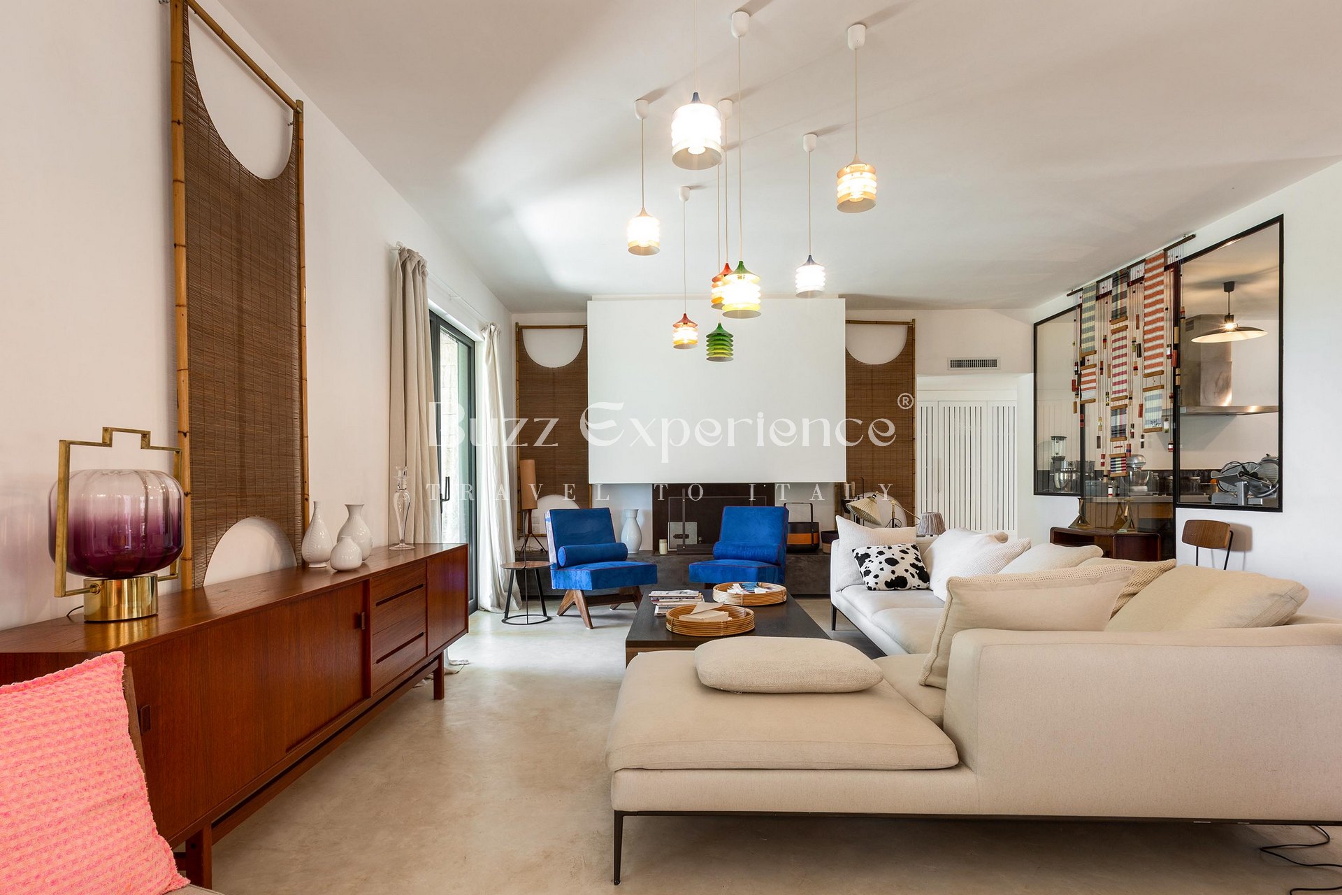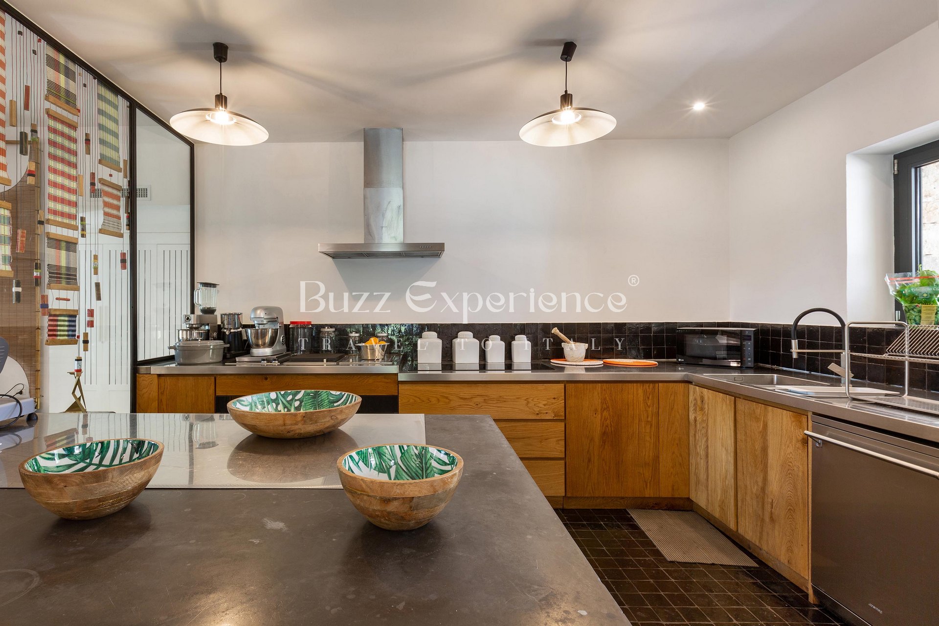 The main residence features bright, open spaces defined by large windows and contemporary design pieces. The spacious living room flows into a dining area and a fully equipped professional kitchen, complete with induction cooktop, Teppanyaki grill, double dishwashers, deep freezers, and high-end appliances.